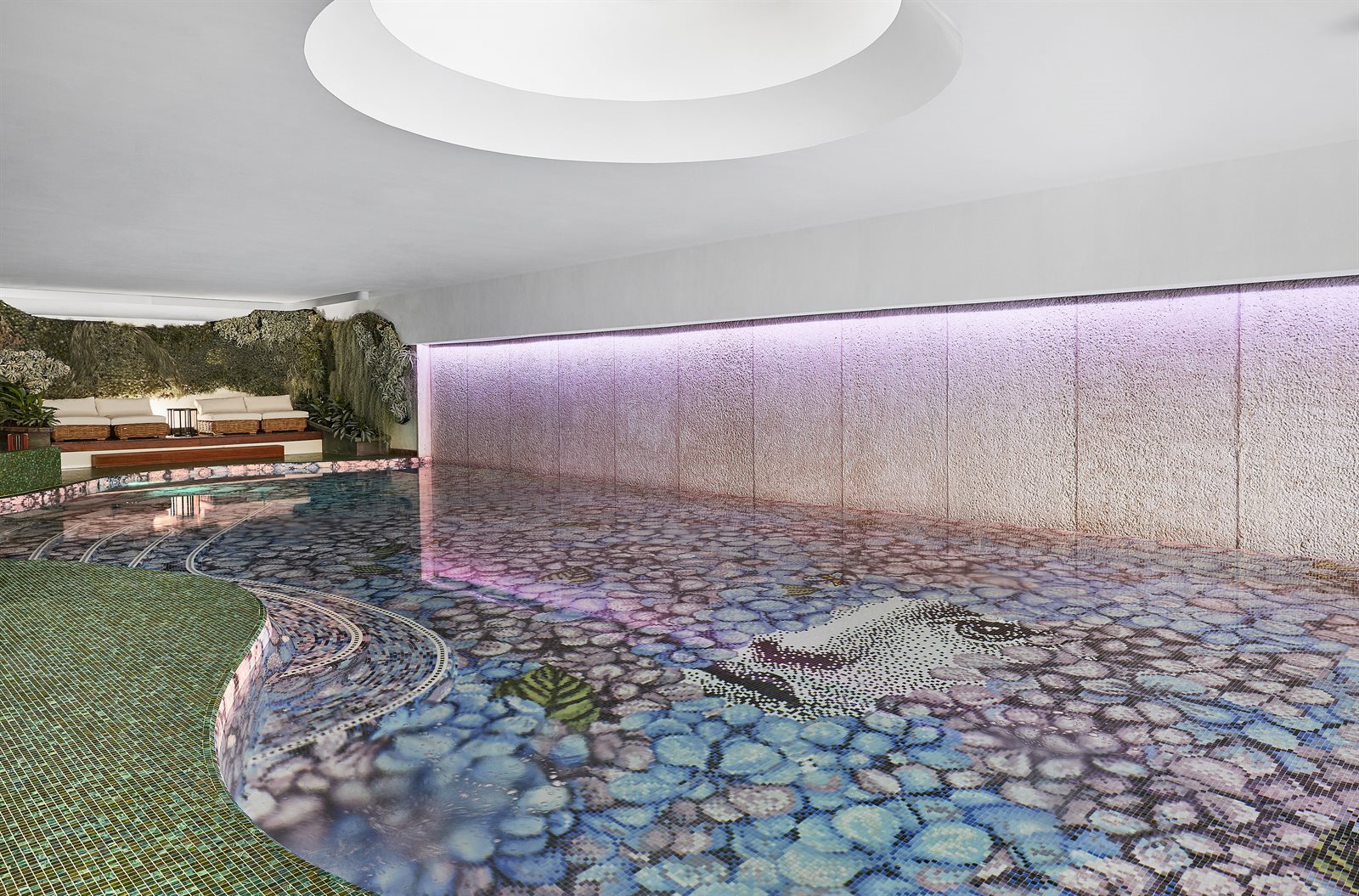 Ortensia, the Bisazza decorative motif – one of several created as part of the recent partnership with FORNASETTI – plays a starring role in the new swimming pool at L’Albereta Relais & Chateaux, a stunning hotel nestled in the hills and famous vineyards of Franciacorta, in Northern Italy. Bisazza interpreted one of the most iconic subjects of Fornasetti`s imagery through the digital mosaic technique, using 600.000 mosaic tiles.