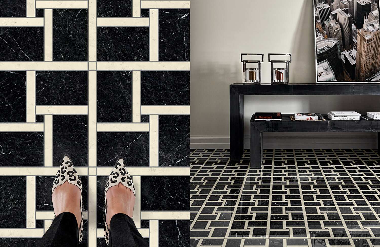 Marble squares, hexagons, triangles and trapezoids come together in two-tone patterns or decorative designs with a 3D look.